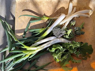 「冬の恵み」(2026/1/25) ネギとブロッコリの脇芽。 ネギは長ネギと下仁田ネギが順調に生育。 ブロッコリは巨大な頂上蕾を収穫後、脇芽が出てきた。 |